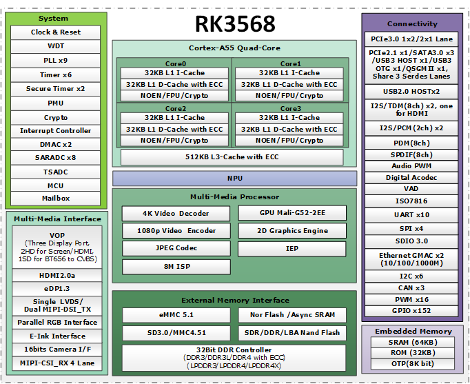 瑞芯微RK3568 CPU为四核Cortex-A55,采用全新Arm v8.2-A架构,效能有效提升;GPU为Mali-G52 ,双核心架构,图像API支持OpenGL ES 3.2, 2.0, 1.1,Vulkan 1.1。内置瑞芯微自研第三代独立NPU,可提供1T算力,支持Caffe/TensorFlow/TFLite/ONNX/PyTorch/Keras/Darknet主流架构模型的一键转换。