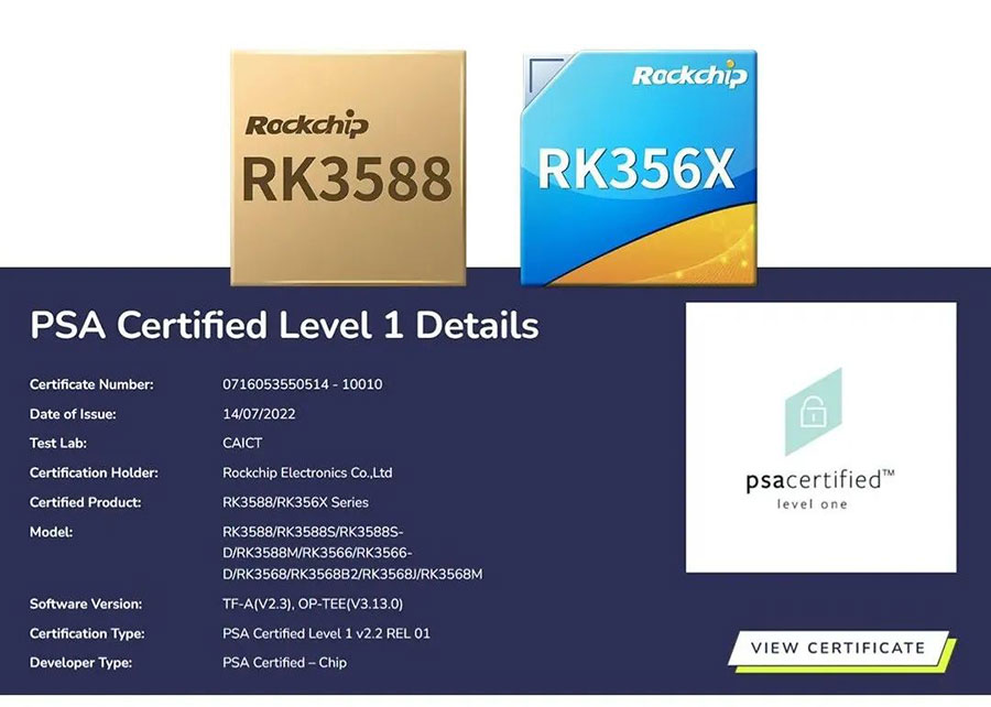 近日,瑞芯微RK3588及RK356X系列芯片(包含RK3588/RK3588S/RK3588S-D/RK3588M/RK3566/RK3566-D/RK3568/RK3568B2/RK3568J/RK3568M)正式通过PSA Certified Level 1安全认证。