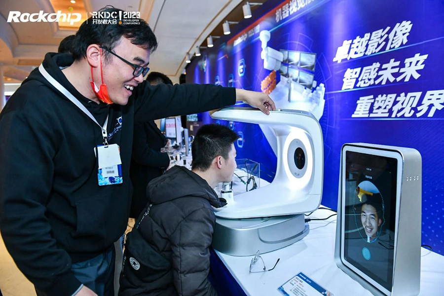在机器视觉展区,展出了多款基于瑞芯微机器视觉方案RV1103/RV1106/RV1108/RV1109/RV1126的前端及后端应用,涵盖IPC、门禁闸机、智能门锁、3D结构光模组、车载影像等,采用一系列瑞芯微自研技术包括星光ISP、智能算法、低功耗快启、智能压缩编码、双目融合拼接、数字防抖等。