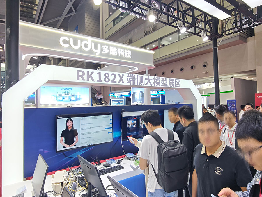 端侧大模型展区,展出RK182X端侧AI算力协处理器及系列相关应用。RK182X具备大算力、高带宽特性,支持3B/7B大模型突破百token/s输出,可根据算力需求叠加一个或多个RK182X协处理器,为终端设备提供前所未有的算力灵活性,针对端侧AI复杂计算需求,特别是在多路视觉分析领域如智能安防、智能社区、智能校园等提供安全、可靠、低成本的AI部署选择。