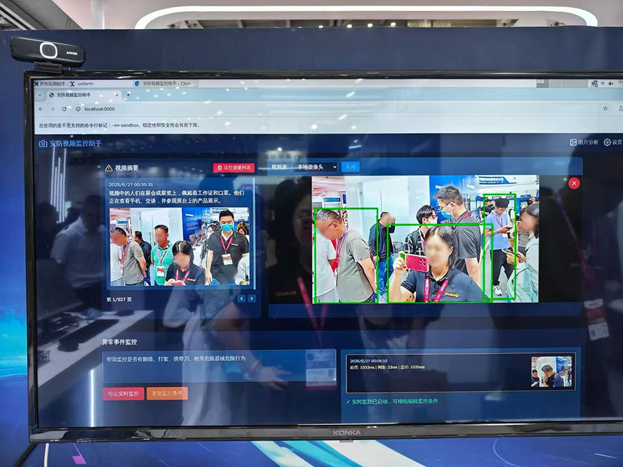 RK3588负责视频场景切片,RK182X负责加速多模态模型推理,实现接近实时的处理性能。该方案可应用于多种场景,例如针对多路摄像头长时间监控的场景,可自动监看现场视频,生成简洁的视频文字摘要。同时支持任意定制的万能异常事件布控。