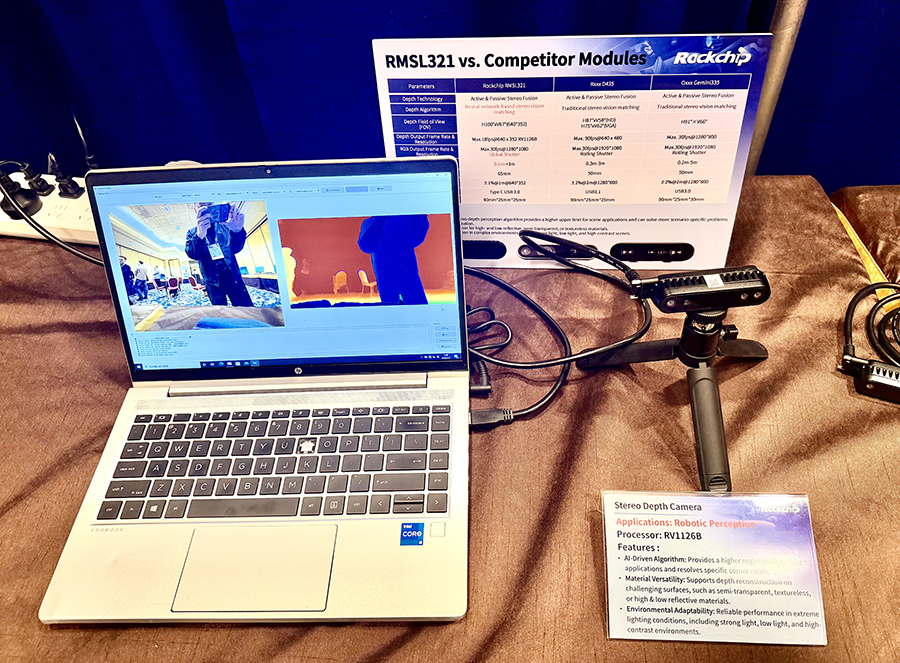 • 机器视觉:展示了系列搭载新一代视觉芯片RV1126B/RV1106B/RV1103B的最新技术和成果,基于自研视觉芯片与算法,支持3D感知、AOV3.0、视频防抖及穿戴式AI视觉等功能,广泛应用于安防、工业检测、运动DV、AI眼镜、车载等领域。