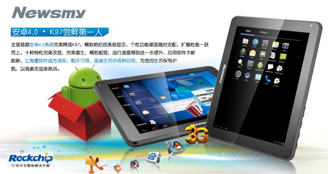 Tablets like Newsmy K97, Window N90, Cube U9GT2 and Telecast T76 are on the list of first , and the ICS pre-installed products are available on local brand stores and online shops. U.S. and European markets also get access to RK2918 tablets manufactured by overseas ODMs.