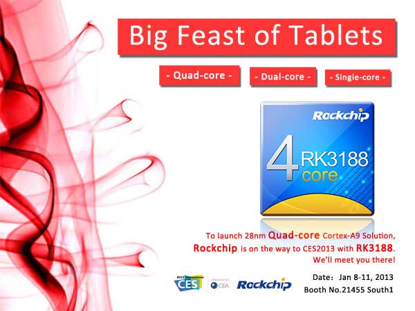 We warmly welcome you to our booth at CES2013, Jan 8th ~11th. We’re going to launch our latest technique of 28nm Quad-core Cortex-A9 Solution RK3188.