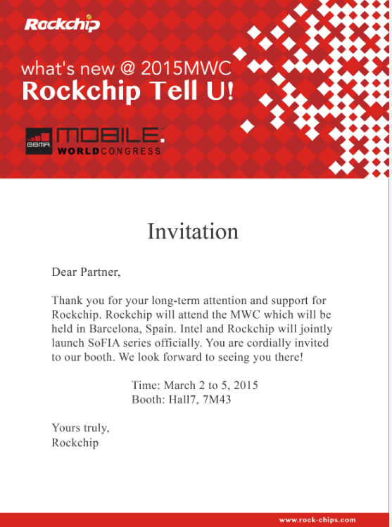 Dear Partner, Thank you for your long-term attention and support for Rockchip. Rockchip will attend the Mobile World Congress held in Barcelona, Spain. Intel and Rockchip will jointly launch SoFIA series formally during the congress days. You are cordially invited to our booth. We look forward to seeing you there!