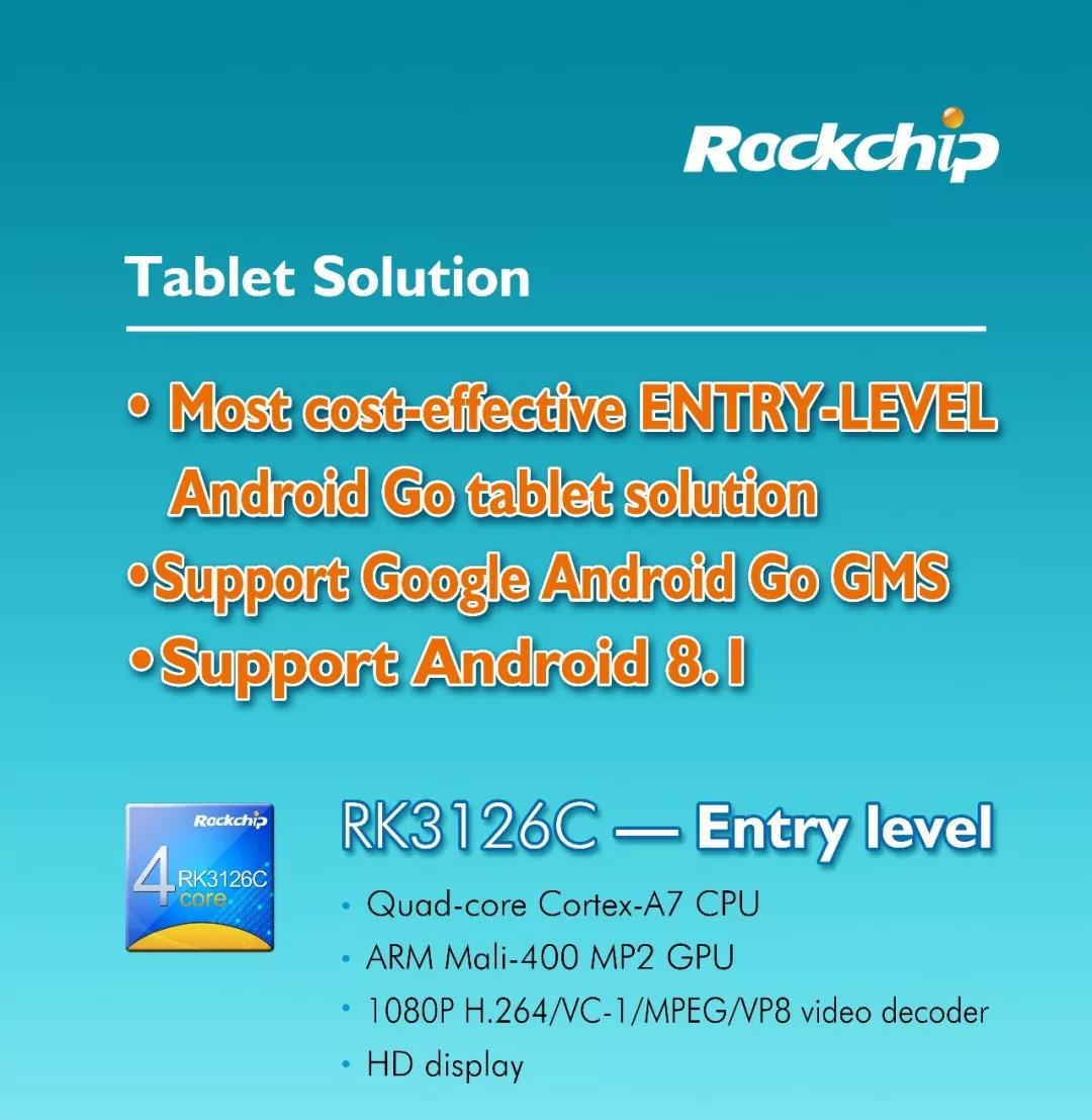 RK3126C is the BEST choice of high cost-effective entry-level tablet solution in the market, which adaptable to Android 8.1 and supports Android Go GMS authentication.