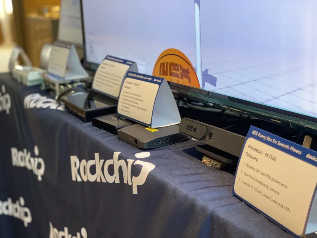 In the Machine Vision Area, an edge computing server equipped with RK3588 was displayed, which can improve the computing power in various fields of machine vision; the IPC products equipped with the new generation machine vision solution RV1106/03, with a first frame stable image of less than 200ms, support for HDR, and ultra-low power consumption; It also demonstrated the use of RV1126 as a video-doorbell, supporting dual cameras, 2K HDR, and bidirectional audio features; a game box installed the multimedia application chip RK3528 was released at its first time in the booth. RK3528 is compatible with IPTV/OTT boxes, cloud terminals, electric power and industrial products. It supports 4K and has high performance but low power consumption. The decoding capability up to 8K, it also supports AVS2 and HDR VIVID standards. U3 and PCIE high-speed interfaces also provide more extensibility for the chip.